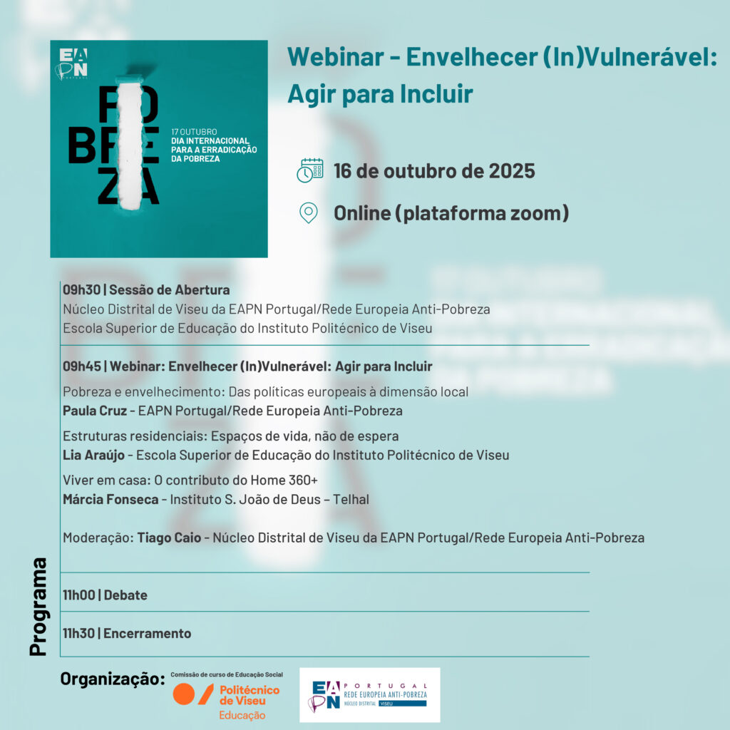 O Webinar – “Envelhecer (In)Vulnerável: Agir para Incluir”, organizado pela ESEV e EAPN-Viseu, vai decorrer no próximo dia 16 de outubro, entre as 09h30 e as 11h30, em formato online, com o objetivo de promover a reflexão acerca da relação entre envelhecimento e vulnerabilidade social.