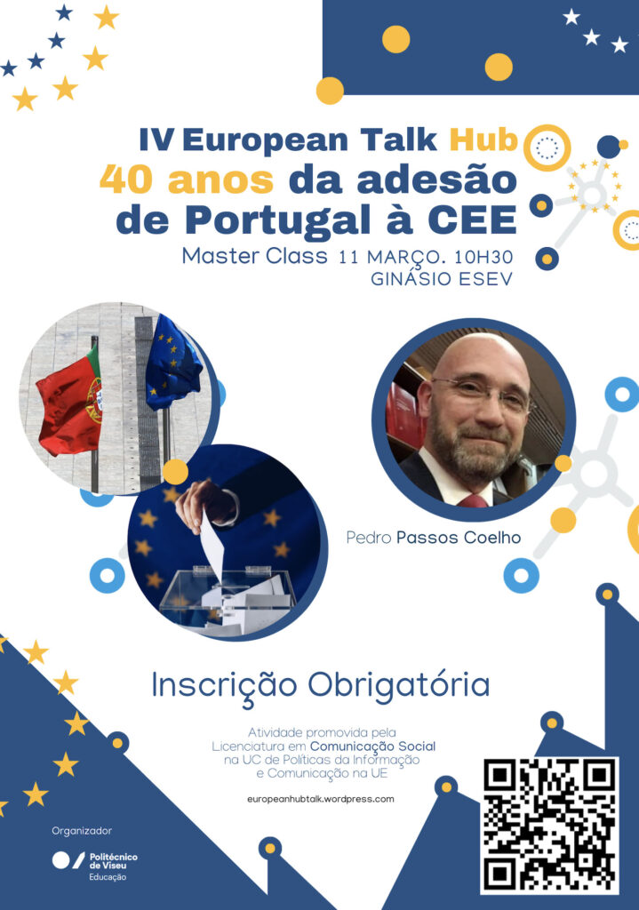 No âmbito da Unidade Curricular de Políticas de Informação e Comunicação da União Europeia, lecionada ao 3.º ano do curso de Comunicação Social da Escola Superior de Educação de Viseu, vai realizar-se uma conferência subordinada ao tema “40 anos de Adesão de Portugal à CEE”, que contará com a presença de Pedro Passos Coelho, antigo Primeiro-Ministro de Portugal.