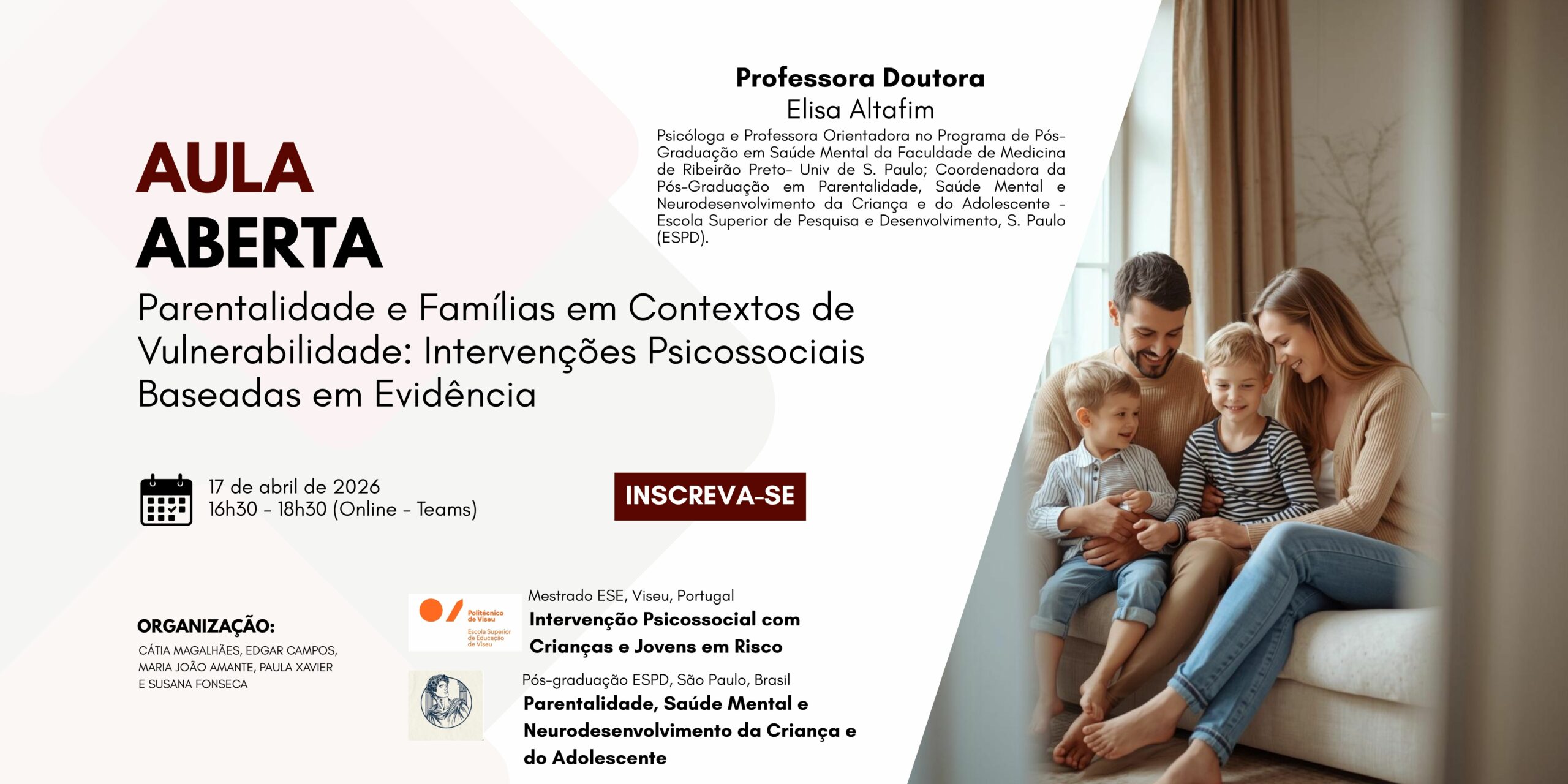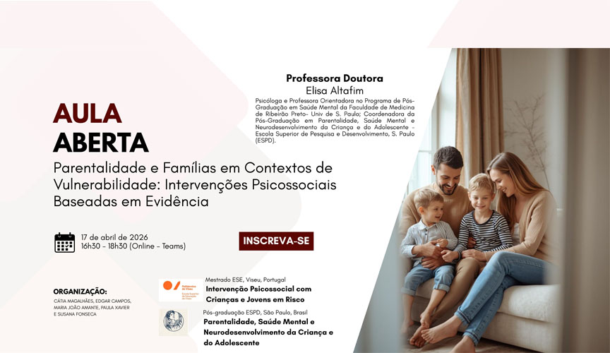 No âmbito do Curso de Mestrado em Intervenção Psicossocial com Crianças e Jovens em Risco e do Curso de Pós-Graduação em Parentalidade, Saúde Mental e Neurodesenvolvimento da Criança e do Adolescente, da Escola Superior de Pesquisa e Desenvolvimento (ESPD), em São Paulo, Brasil, irá realizar-se uma Aula Aberta, com o título “Parentalidade e Famílias em Contextos de Vulnerabilidade: Intervenções Psicossociais Baseadas em Evidência”, no dia 17/04/2026, entre as 16h30 e as 18h30, em formato online (Teams).